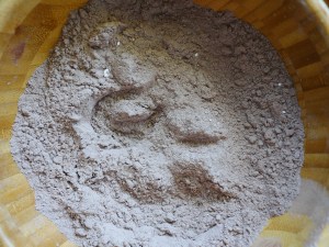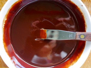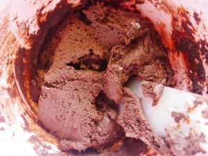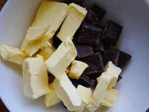 Preheat the oven to 180c/350f/gas mark 4. Stir together the flour, cocoa powder, baking powder and bicarb and set aside. Put the sugar in a large mixing bowl and set that aside too. Place the chopped up vegan butter and chocolate in a bowl and microwave gently (stir every 20 seconds) until just melted.