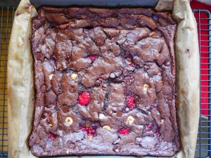 Now add the flour mixture and combine, making sure there are absolutely no visible floury bits. You will end up with a soft dough (a bit like a very soft cookie dough). Add and the hazelnuts and chocolate chips, reserving a few for the end (if you can remember). Spoon the dough into your prepared tin and use your finger or a teaspoon to make little holes randomly in the dough and press the raspberries in. This is the best way to avoid them breaking up when you are mixing the dough. Then push in the remaining hazelnuts and chocolate chips. Smooth the top of the mixture as best you can (I tend to press it down with the palms of my hands) then bake for approximately 14-15 minutes. The sides of the brownie will look slightly puffed (it does shrink back a little) and the top should look set, although it will be wobbly underneath. When it looks like this, remove from the oven and allow to cool completely (they will firm up as they cool) before attempting to lift them out.