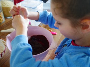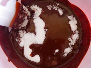 Lightly whisk the milk and vanilla into the chocolate mix then pour it on to the sugar. Beat for a minute until thoroughly mixed. This is the bit that contributes to that sugary brownie crust you know and love!