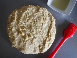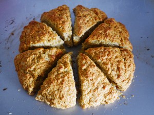 Place on a large baking sheet (line it with baking paper if you like) and pat down into a fat disc, about 1 inch thick. Use a dough scraper/cutter or a ruler to press through the dough, right down to the baking sheet, to make quarters then eighths. Brush with a little milk (as you can see from the pictures, I brushed with milk before cutting – I recommend doing it once you’ve finished). Place in the middle of the oven and bake for about 16-18 minutes. The top will feel firm when pressed and look golden and crusty. A skewer should come out clean.