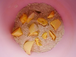 Place the flour, baking powder, bicarbonate of soda, cardamom and vegan butter in a mixing bowl and rub together until you have a rubbly, almost sandy mixture. Stir in the sugar.