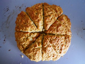 Place on a large baking sheet (line it with baking paper if you like) and pat down into a fat disc, about 1 inch thick. Use a dough scraper/cutter or a ruler to press through the dough, right down to the baking sheet, to make quarters then eighths. Brush with a little milk (as you can see from the pictures, I brushed with milk before cutting – I recommend doing it once you’ve finished). Place in the middle of the oven and bake for about 16-18 minutes. The top will feel firm when pressed and look golden and crusty. A skewer should come out clean.