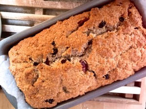 Pour the wet mixture on to the dry ingredients and mix with a wooden spoon or spatula until combined. Then add the cherries, raisins and/or almonds, if using, and continue to mix thoroughly. Watch out for pockets of remaining dry bits! You’ll end up with a rather stiff cake batter – a consistency somewhere between cake and bread dough mix.