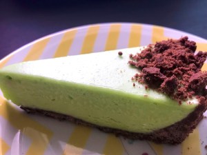 To cut a long story short, I noticed that the freshly-whipped, uncooked aquafaba meringue resembled – both in taste and texture – those jars of Marshmallow Fluff I was so fond of using for my old grasshopper pie. I decided to have another go at a vegan pie and this is what I came up with. Obviously there are other elements to this pie that aren’t in the original (blended cashews and coconut oil help to provide creaminess and structure) but the overall taste is one of familiar, nostalgic minty bliss. The pie didn’t set as firm as I would have liked so I put it in the freezer – but happily it slices easily almost immediately after removing from the freezer (I slice mine into ten pieces and transfer them to a ziplock bag) and is edible within minutes. I suspect the aquafaba prevents it from freezing into an iceberg that takes hours to defrost – it just stays creamy. I will definitely be using aquafaba in all kinds of vegan ice-cream situations in the very near future! Meanwhile, this is pretty much like the best chocolate peppermint ice cream you ever had, in pie form.