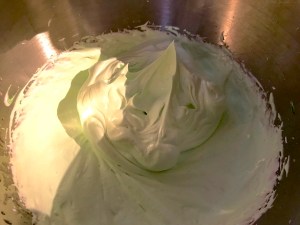 For the aquafaba meringue: Place the aquafaba (that’s the chickpea water), sugar, cream of tartar and the green food colouring (if using) into a mixer bowl and whisk using a balloon whisk (electric!) for around ten minutes on a very high speed. I use earplugs when my Kitchen Aid is used in this way – you might want to do the same!