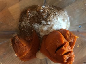 Simply place all of the ingredients – the pumpkin, drained tofu, sugar, syrup, cornflour, zest (if using), spices and salt – into a processor and blend until completely silky smooth and creamy.