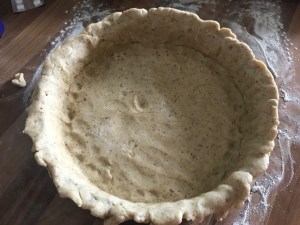 After ten minutes, remove the pie crust from the oven and use a serrated knife to carefully trim off the excess pastry*. Reduce the oven temperature to 180c /350f / gas mark 4 and set the pie crust aside for a moment.