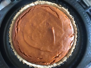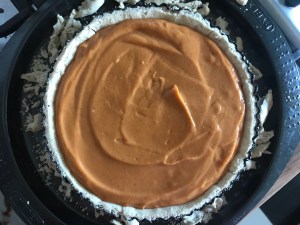 Pour the pumpkin filling into your pie crust and place in the middle of the oven (180c/350f/gas mark 4) and bake for 40-45 minutes (check after 40). The top of the pie will look puffed up and the centre should be set, maybe with the faintest wobble. It will flatten – and firm up – as it cools. Crush up the pecans and sprinkle around the edges and chill completely before serving – it’s even better the next day.