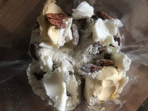 Place the flour, Trex/Crisco, vegan butter and pecans in a processor and blitz until sandy (if you’re using a Vitamix you may need to lift the jug and shake it every couple of seconds). This shouldn’t take more than ten seconds. Add the sugar and briefly pulse. Don’t be tempted to over process at any stage – this will over develop the gluten and you won’t get that melt-in-the-mouth pastry! If making by hand, rub together the fats with the flour until sandy, stir in the sugar and chopped pecans then add the liquid and bring together, continuing as below.