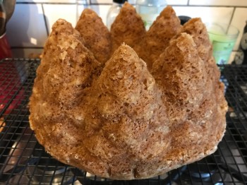 6. Pour the batter into your prepared tin, making sure you get batter into the very bottom ‘tree tops’.  Place in the middle of the hot oven for 40-45 minutes. After 40 minutes test with a skewer; it should come out clean and the top will look well risen and springy. Damp crumbs are fine; raw batter is not. You can always pop it back in the oven for a few more minutes.