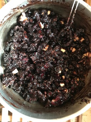 Break up the biscuits into smallish pieces (I break them by hand then bash with a rolling pin for a bit) and add the chopped nuts, cranberries and marshmallows. Set aside. In a large pan, melt the butter, cocoa powder and golden syrup over a low heat, stirring until you have a chocolatey mixture. Add the broken biscuits, nuts, cranberries and marshmallows. Stir until everything is completely coated.