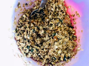 Spread evenly over your lined baking sheet/tin/tray and bake for 30-40 minutes, shaking the pan a bit and stirring the mixture every 10 minutes or so. When it looks reasonably golden (it won’t go crunchy until it’s cold) remove from the oven and stir in the cranberries. Leave to cool on the tray and transfer to an airtight container when completely cold.