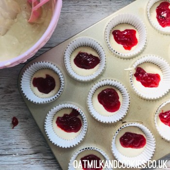 Fill each muffin case with a heaped tablespoon of batter, then add a heaped teaspoon of jam to each one. Try to keep the jam in the middle. Now cover each one with the remaining batter. Try to do this quite quickly, as vegan bakes need to get into the oven as quickly as possible.