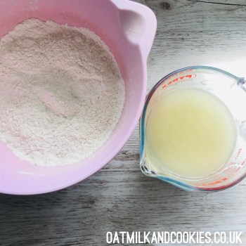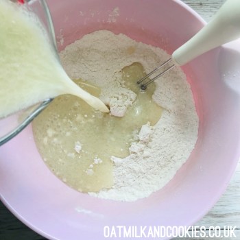 Stir together the dry ingredients – flour, sugar, baking powder and salt in a large bowl. In a separate jug, combine the wet ingredients – milk, oil, vinegar and vanilla.