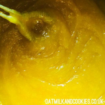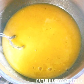 Now you can move on to the filling. In a medium saucepan, whisk together the sugar, cornflour and turmeric, then pour in the lemon juice and zest. Combine until you have a paste, then over a medium-low heat, slowly add the milk. Keep stirring the whole time; it will start to bubble and thicken. Allow about five minutes of very gentle bubbling then whisk in the butter until it is smooth and creamy.