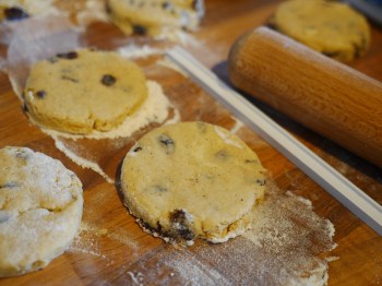 Bring the dough together with your hands – you should be able to make a ball without too much effort. Roll it out to a thickness of just under 1cm. Cut using a round cutter, about 2.5″/3″. You should get around 12 Welsh cakes from this.