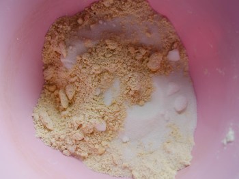 Measure the flour, baking powder, mixed spice and salt into a mixing bowl and give it a stir. Add the Stork (in chunks) and rub together until you have a sort of chunky sandy texture. Sprinkle in the sugar and stir it all together.