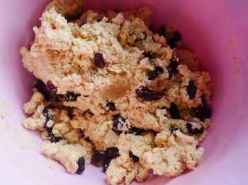 Now pour in the milk and use a spoon to bring the mixture together. When it starts to clump (there’s got to be a better word for this but I can’t think of it!) add the raisins.